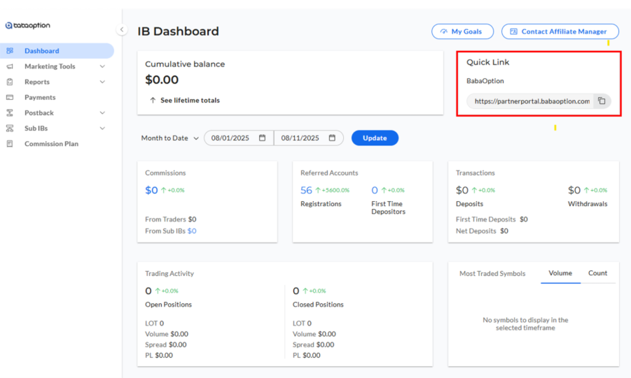 - Log in to your BABA Option Partner Portal at partners.babaoption.com