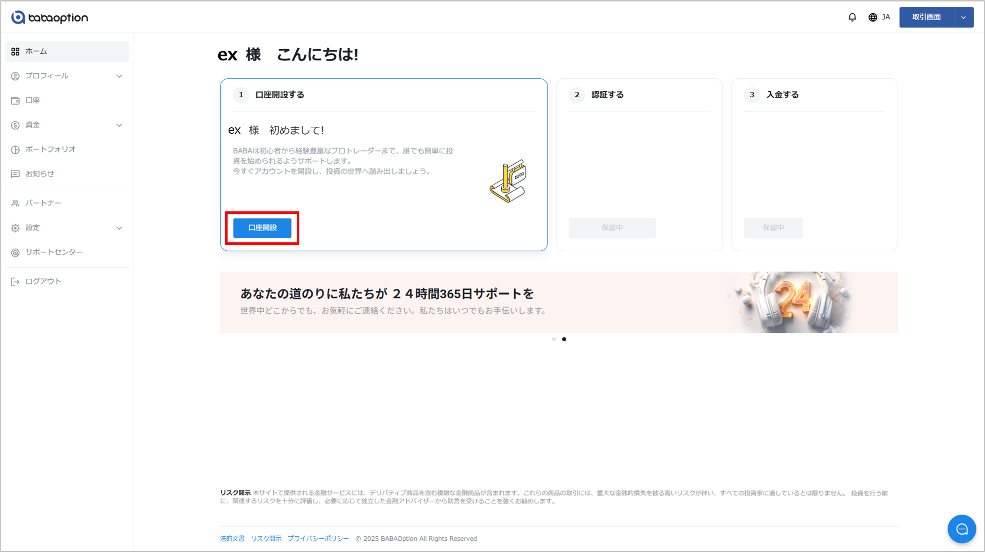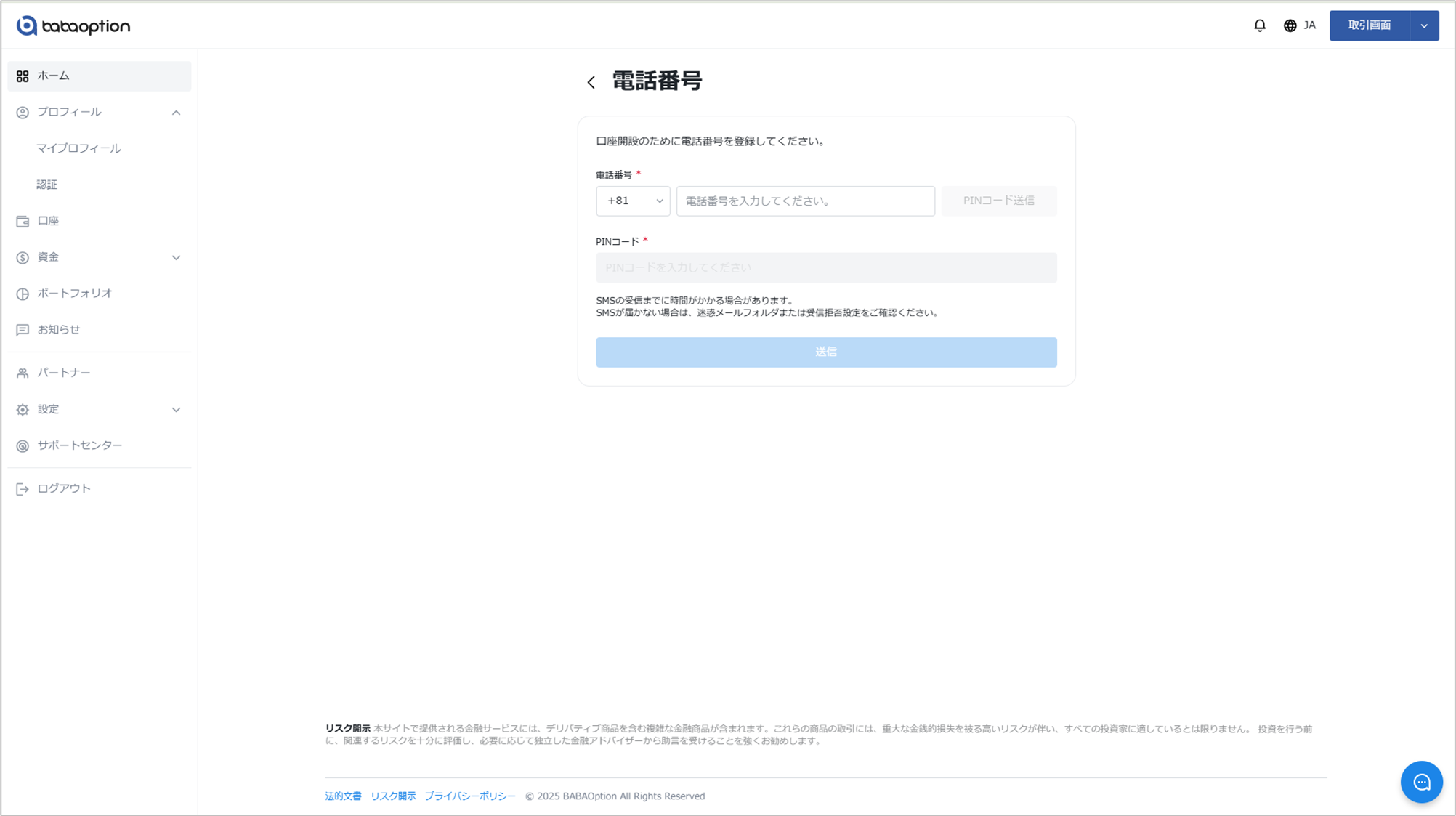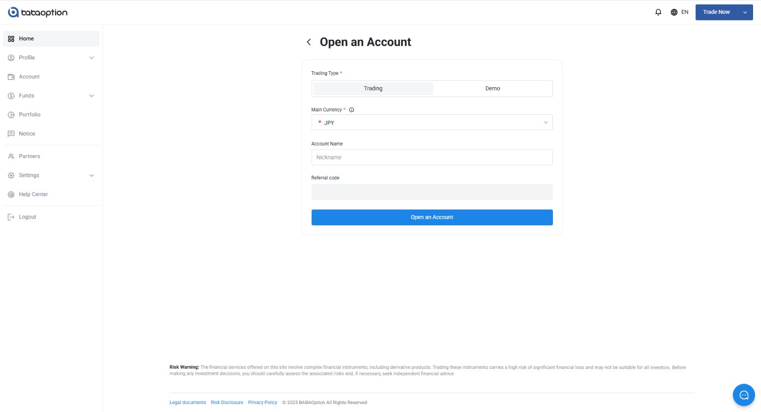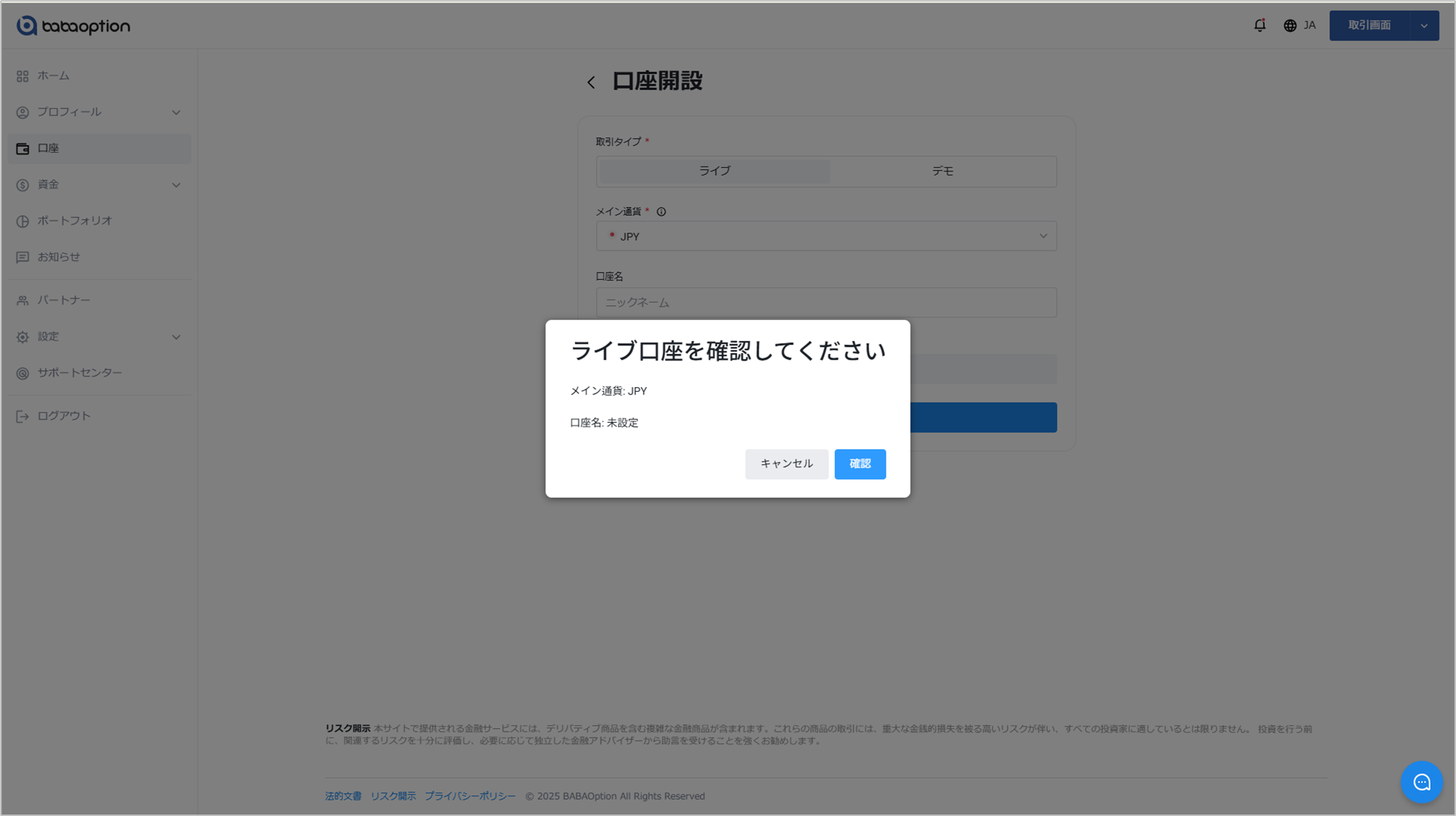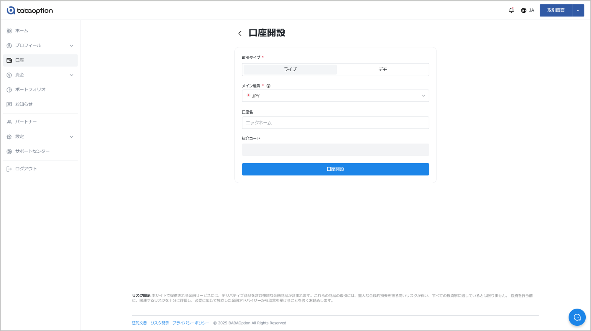 ライブ口座の開設方法 Updated 2026年01月27日 13:42 ライブ口座を開設するにはお客様ポータルにログイン「口座開設」をクリック。 電話番号が未認証の場合は、先に電話番号の認証を行ってください。電話番号の認証が完了すると、次の手順に進めます。 「ライブ口座」または「デモ口座」から作成したい口座の種類を選択 ドロップダウンメニューから、メイン通貨を選択 以下の項目を入力します(任意) 口座名 紹介コード 「口座開設」を選択し、内容を確認して確定新しく作成したライブ口座は、アカウントに表示されます。 関連 binary option trading account image.jpg (60 KB) image.jpg (60 KB) image.jpg (50 KB)