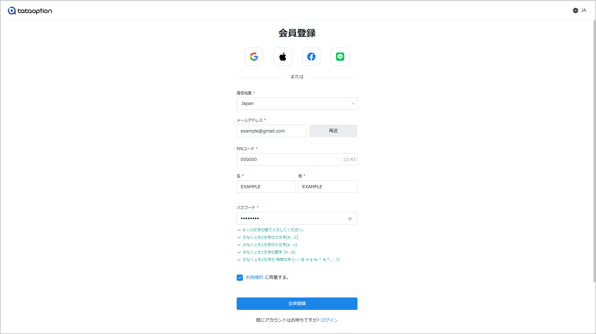 - メールアドレス:確認用のPINコードを受け取るため、有効なメールアドレスを入力します。